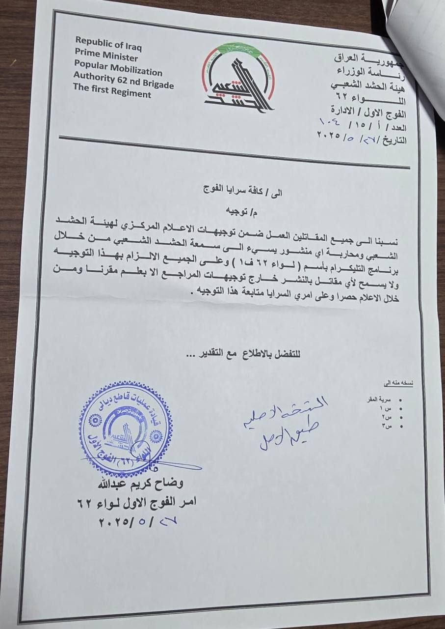 - وذكرت القيادة، في بيان رسمي أن “التحقيقات التي أجريت بإشراف مباشر قائد عمليات قاطع ديالى للحشد الشعبي، أظهرت بشكل قاطع أن الكتاب المتداول مفبرك، في حين أن النسخة الرسمية والمعتمدة من الهيئة هي الكتاب الثاني، الصادر وفق الأطر القانونية والإدارية المعتمدة”