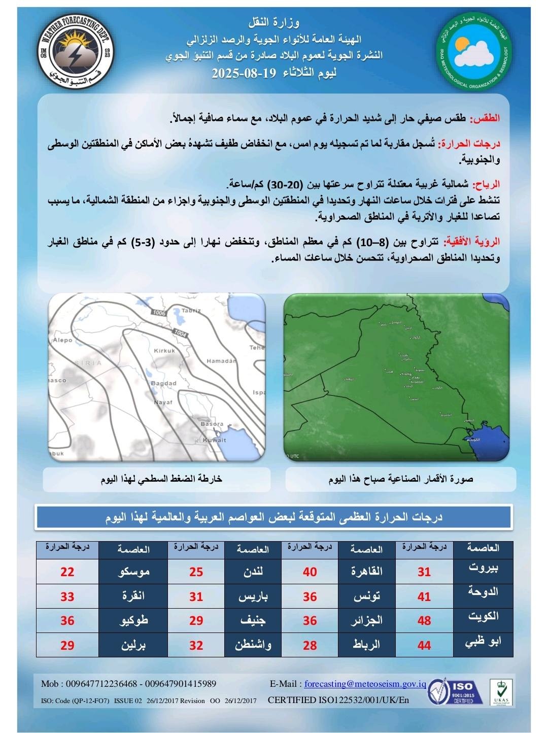 تشير توقعات الطقس، اليوم الثلاثاء (19 آب 2025)، الى أن درجات الحرارة في البلاد مستمرة في الانخفاض خصوصا في المنطقتين الوسطى والجنوبية، حيث يكون الطقس صيفي حار إلى شديد الحرارة في عموم البلاد، مع سماء صافية إجمالاً، فيما يتصاعد الغبار والأتربة في المناطق الصحراوية.