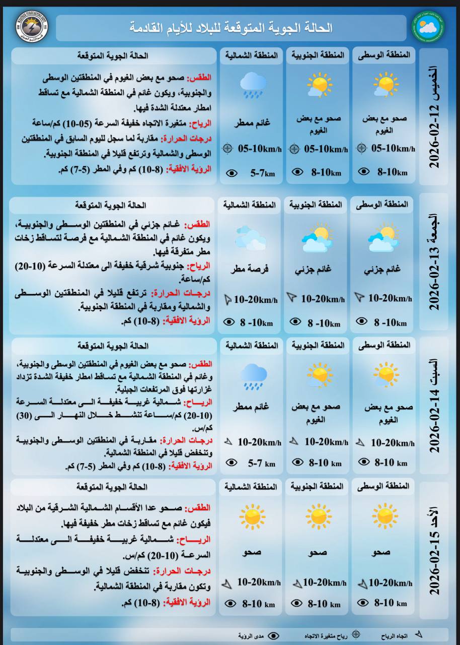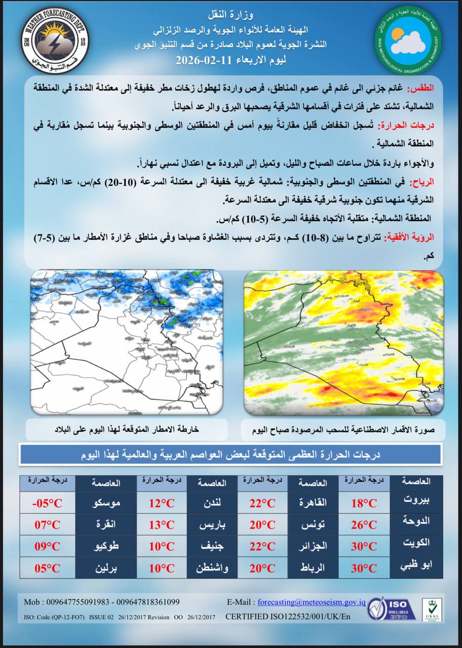الأنواء الجوية تتوقع هطول أمطار رعدية متفاوتة الشدة على مناطق متفرقة خلال هذه الليلة ونهار اليوم الأربعاء مع انتشار الغيوم في أجواء أغلب المدن العراقية