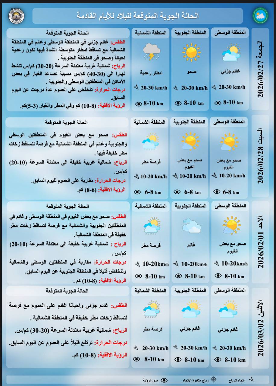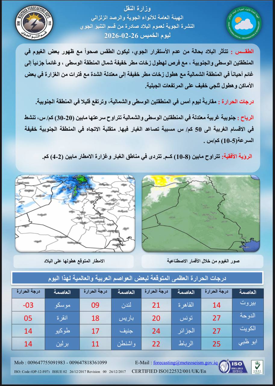 اخر الاخبار الاخبار محلي الأنواء الجوية: أمطار رعدية وغبار وانخفاض في درجات الحرارة غداً 26 فبراير، 2026 9:16 صباحًاشارك القصة الأنواء الجوية: أمطار رعدية وغبار وانخفاض في درجات الحرارة غداً الخط مقالات جديدة الشيخ أكرم الكعبي: تباً للمعايير الأخلاقية الازدواجية للغرب خريجي جزيرة إبستين الذين يجعلون الباطل حقاً والحق باطلاً شطرنج البحار وصدام الإرادات: لغز “إسلام آباد” وطبول حرب الناقلات إيران تتمسك بمواقفها في عودة المفاوضات أنقرة تفضح جرائم الاحتلال وتكسر جدار الصمت الغربي سماحة الشيخ أكرم الكعبي: السياسة الأمريكية هي نريكم ما نرى ونعرفكم ما نعرف أسعار صرف الدولار في بغداد والبصرة وأربيل اليوم الثلاثاءمقالات عشوائية برنامج فيد باك | الحلقة 34 القوات المسلحة اليمنية: نفّذنا عمليةً نوعيةً استهدفت قاعدة “ناحال سوريك” العسكرية بيافا المحتلة بالأنفوغراف || أزمة المياه تتفاقم ما الحلول ؟ برنامج رأيكم || فضوا الزحام قبل ان تفرضوا الحزام… المرور تضيق الخناق على المواطن برنامج ما لم يذكر || جمهورية عبد الكريم قاسم.. ثورة ام انقلاب ؟ المحكمة الاتحادية تحدد 11 شباط موعداً للنظر بالطعون المقدمة ضد القوانين الثلاثة