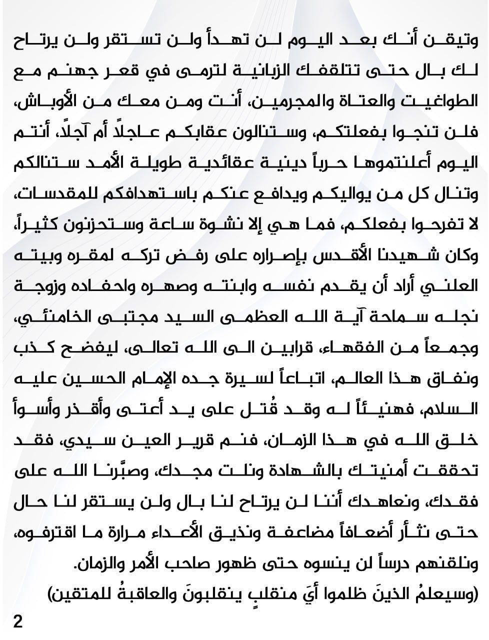 الامين العام للمقاومة الاسلامية حركة النجباء سماحة الشيخ أكرم الكعبي دام نصره ينعى نائب المعصوم الامام المهدي عج سماحة المرجع الديني آية الله العظمى السيد الامام علي الخامنئي قدس سره