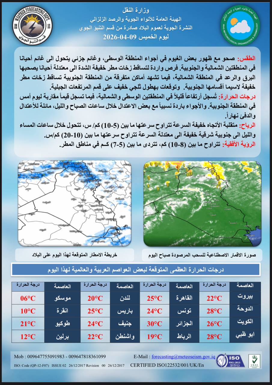 اخر الاخبار الاخبار محلي ألانواء الجوية: أمطار وغبار الأسبوع المقبل 9 أبريل، 2026 10:55 صباحًاشارك القصة ألانواء الجوية: أمطار وغبار الأسبوع المقبل الخط مقالات جديدة أسعار صرف الدولار في بغداد والبصرة وأربيل اليوم الخميس الشيخ أكرم الكعبي: تباً للمعايير الأخلاقية الازدواجية للغرب خريجي جزيرة إبستين الذين يجعلون الباطل حقاً والحق باطلاً شطرنج البحار وصدام الإرادات: لغز “إسلام آباد” وطبول حرب الناقلات إيران تتمسك بمواقفها في عودة المفاوضات أنقرة تفضح جرائم الاحتلال وتكسر جدار الصمت الغربي سماحة الشيخ أكرم الكعبي: السياسة الأمريكية هي نريكم ما نرى ونعرفكم ما نعرفمقالات عشوائية الحشد الشعبي يعلن إطلاق حملة الشهادة والسيادة مع اقتراب ذكرى الجريمة الأمريكية قرب مطار بغداد بينها مجموعة العراق.. مواعيد مباريات المنتخبات العربية بالتصفيات الآسيوية المؤهلة لكأس العالم تحذير طبي عدوى شرسة تضرب الصغار وتنهك الكبار المرور: قطع جسر الشهداء في بغداد لمدة 7 أيام لصيانته تنقيب تحت التوتر.. بغداد تمضي في استثمار حقول ديالى المتنازع عليها إغلاق 20 ألف مشروع مخالف لشروط السلامة وإحالته إلى القضاء