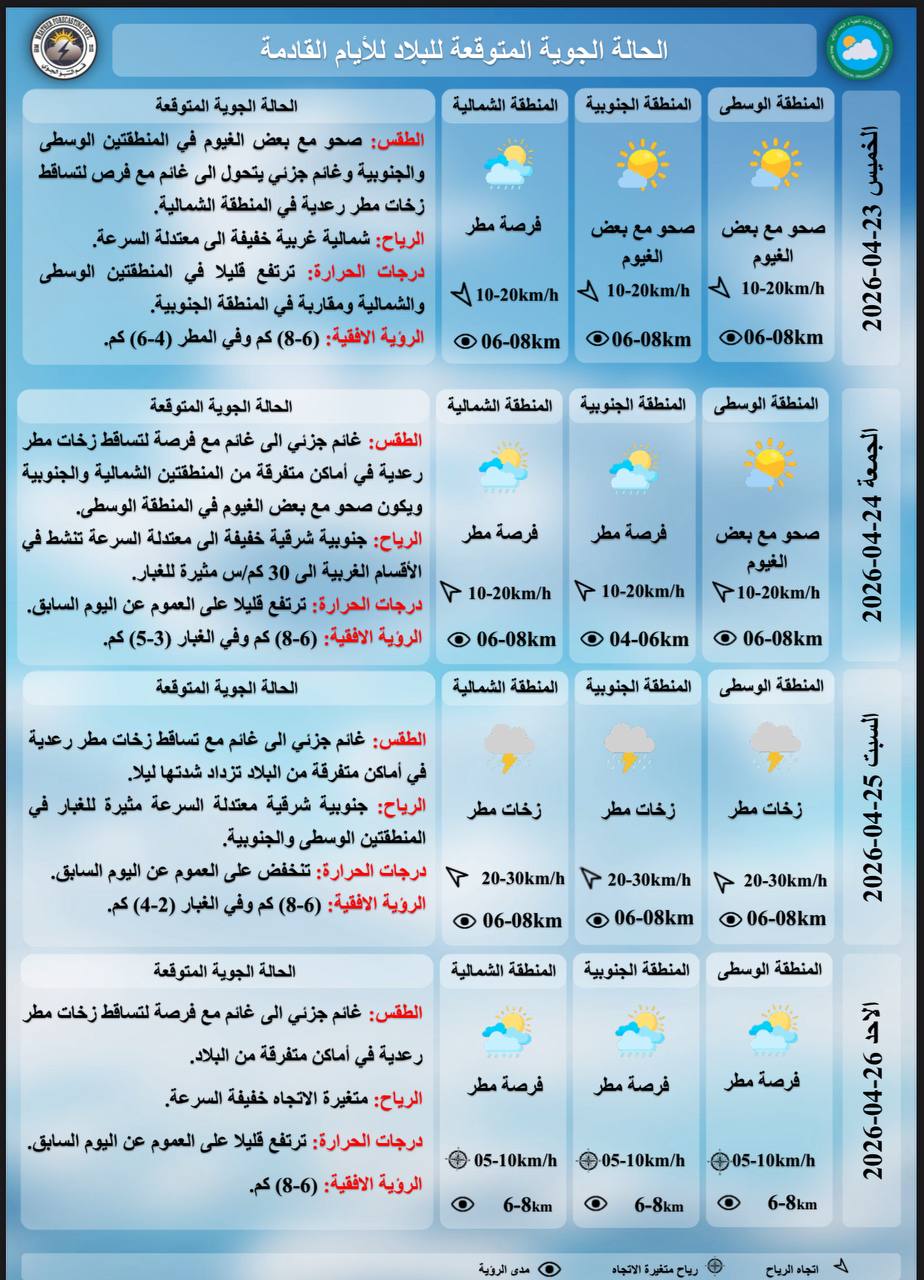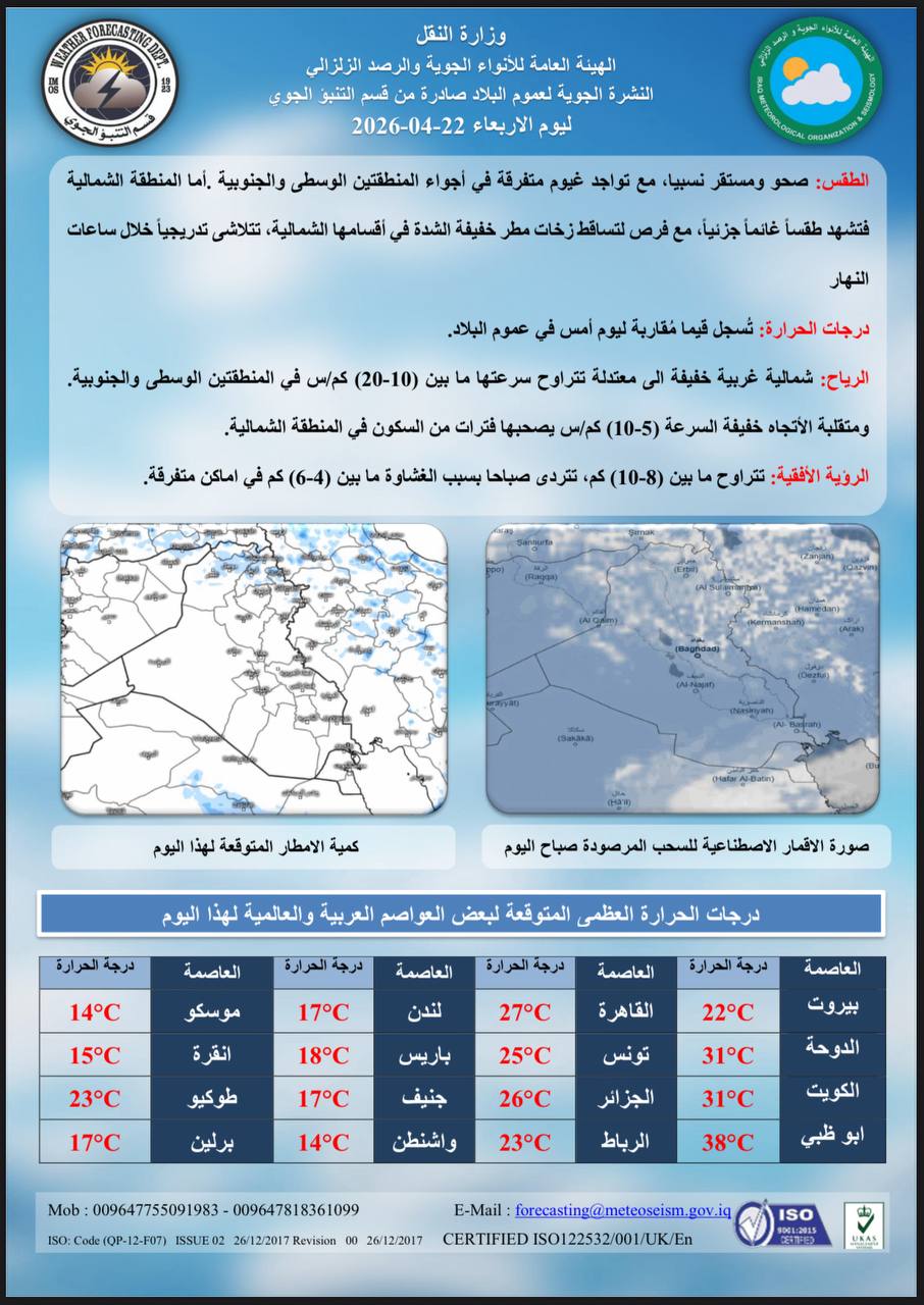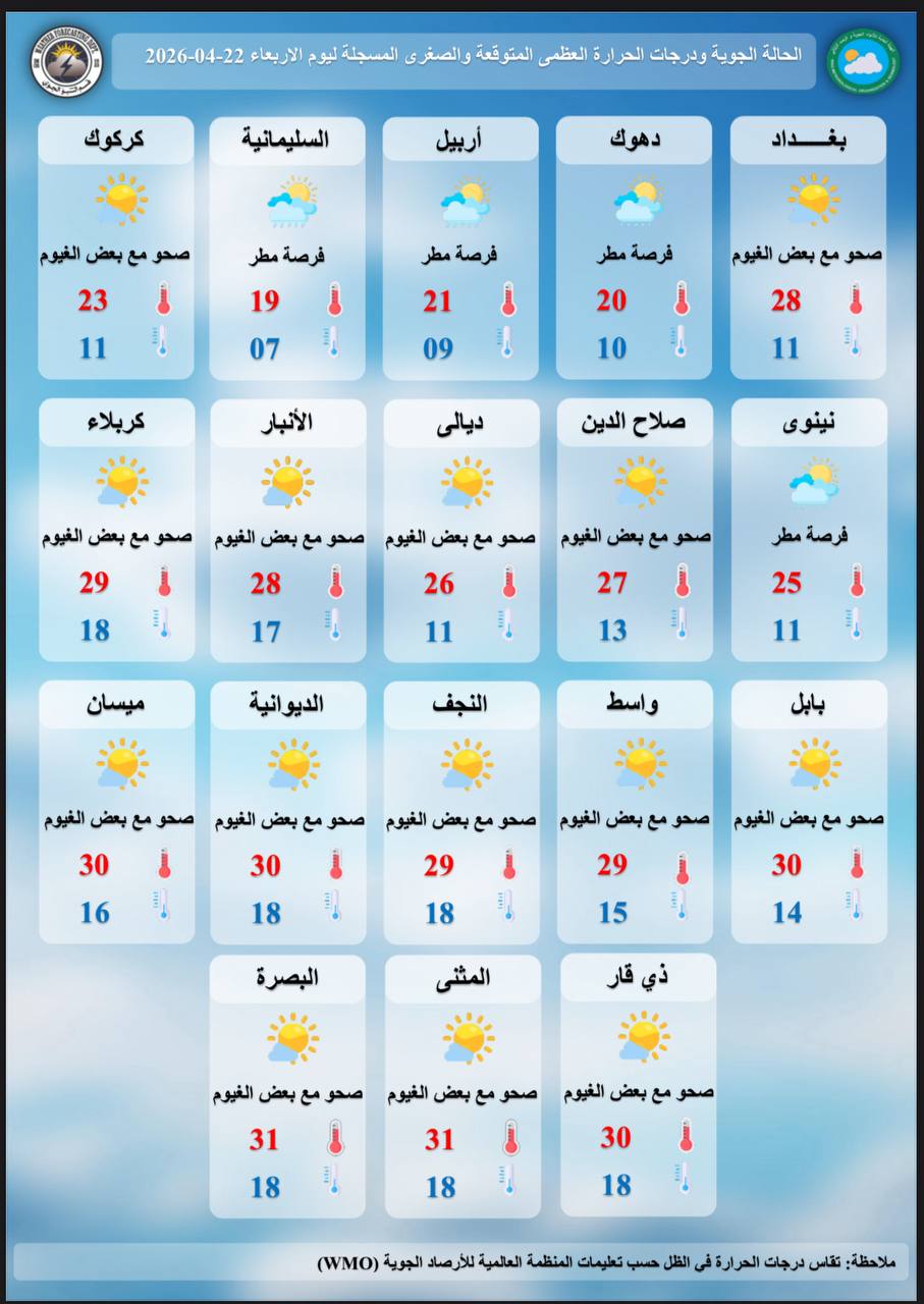 اخر الاخبار الاخبار محلي الأنواء الجوية: أمطار رعدية وغبار وارتفاع في درجات الحرارة حتى الأحد 22 أبريل، 2026 9:41 صباحًاشارك القصة الأنواء الجوية: أمطار رعدية وغبار وارتفاع في درجات الحرارة حتى الأحد الخط مقالات جديدة الأنواء الجوية: أمطار رعدية وغبار وارتفاع في درجات الحرارة حتى الأحد فقه الصبر وانكسار الطاغية: كيف أذلّت إيران نرجسية ترامب؟ من اللاهوت إلى البيت الأبيض: السردية الكاملة لصعود الصهيونية المسيحية أسعار صرف الدولار في بغداد والبصرة وأربيل اليوم الثلاثاء النزاهـة: ضبط (18) متهماً في دوائر التسجيل العقاري ببغداد بينهم موظفون ومعقبون لمخالفتهم الإجراءات القانونية صراع “الدين والسياسية”.. ترامب يتحدى الفاتيكانمقالات عشوائية هيئة المنافذ الحدودية تُحبط محاولة تهريب حاوية مليئة بالمواد الغذائية والعطاريات في ميناء أم قصر الساعدي: لا سند قانوني لتأجيل الانتخابات إعداد مخفي في “آيفون” قد يضاعف عمر البطارية عراقجي: نرفض التفاوض علنا بشأن الملف النووي وإيران لن تتنازل عن أمنها عضو الاتحاد الوطني الكردستاني برهان الشيخ رؤوف للنجباء: تأخير رواتب الموظفين لأكثر من شهرين أمر غير منطقي وغير مقبول يضم 600 ألف مقعد.. إيران تطلق قطار طهران-كربلاء خلال الزيارة الأربعينية