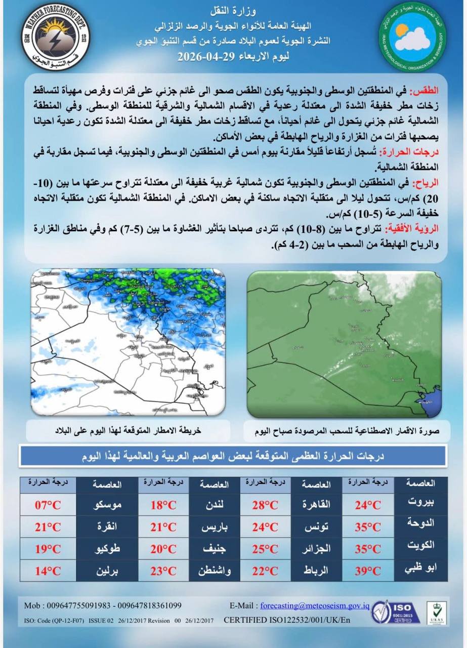 الاخبار محلي الانواء الجوية : حالة الطقس المتوقعة لهذا اليوم 29 أبريل، 2026 9:33 صباحًاشارك القصة الانواء الجوية : حالة الطقس المتوقعة لهذا اليوم الخط مقالات جديدة الانواء الجوية : حالة الطقس المتوقعة لهذا اليوم مجاهدو وكوادر المقاومة الإسلامية – حركة النجباء في رسالة الى اية الله السيد القائد مجتبى الخامنئي نظام HQ-9 الدفاع الجوي || صقر الصين الذي يحكم السماء ويمنع الاختراق طائرات حزب الله الانتحارية تستنزف الجيش الصهيوني وتقيد حركته وتمنع الاستقرار في الشمال أسعار صرف الدولار في بغداد والبصرة وأربيل اليوم الثلاثاء حرس الثورة يحول بقايا العتاد الامريكي لقوة عسكريةمقالات عشوائية برنامج المتصفح || الطب بالعراق.. اسعار مختلفة وادوية مفقودة برنامج هنا العاصمة | النفط بـ 99 والسوق واكف برنامج المحور | تركيا والولايات المتحدة.. صراع على جغرافيا الشمال السوري.. من يحسم أولاً؟ برنامج انت صح || 26-4-2022 الوحدة وتحقيق الانتصار وإنهاء الاحتلال الظالم في فلسطين النفط ينخفض لأدنى من 60 دولارًا لأول مرة منذ أبريل وسط مخاوف الطلب